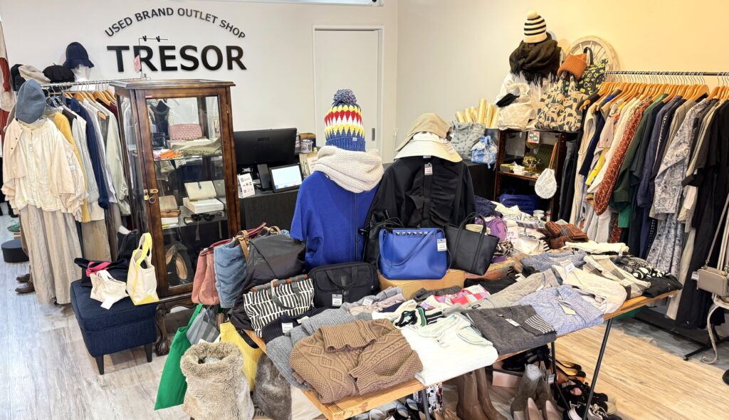 草津市かがやきテラス内にあるUSED BRAND OUTLET SHOP TRESORは、ナチュラル系のセンスあふれるブランド古着やアイテムがたくさん。明るく親しみやすい雰囲気の中で、掘り出し物との出会いが待っています。11:00〜17:00営業・火曜定休で通いやすく、ちょっと覗くだけでもワクワク。新しい“お気に入り”に出会いたい時、ぜひ気軽に立ち寄ってみてください。お洋服の買取もお任せください。